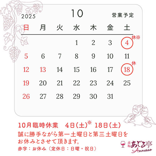 | 2025.9.18 | お知らせ 10月の臨時休業日は10/4(土)、10/18(土)になります。 |
